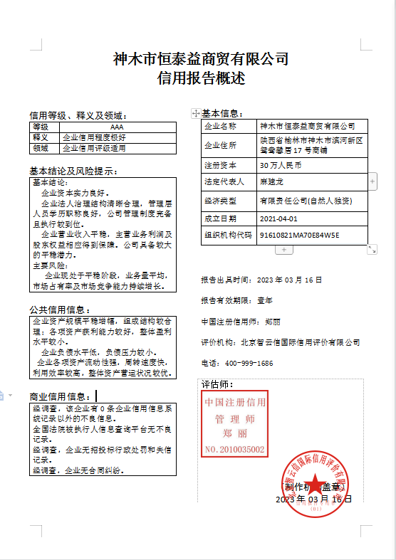 綜合評價: 一、專業(yè)第三方信用評價機構根據國務院《社會信用體系建設規(guī)劃綱要(2014-2020年)》(國發(fā)2014第21號)建設要求,依據中華人民共和國信用行業(yè)標準對該單位的相關信用信息進行綜合評價,并依法出具信用證書和建立信用檔案公示,接受社會監(jiān)督。信用分析師認為,同等條件下,該單位的可信度、信任度和社會責任度相對很高。 二、本信用證書和信用檔案是中立和中性的,它證明該單位已納入社會信用體系的監(jiān)督之中,任何組織和個人可以遵循誠信原則方便地對該單位進行評價(表楊、批評、建議);任何組織和個人可以方便地查詢該單位良好信息、不良信息和整改信息。該單位也可以通過誠信經營不斷增加信用分值和增加良好信用信息記錄,積累信用無形資產。三、根據該單位提供的相關資料,依據中華人民共和國信用行業(yè)標準Q/ZYX 002-2019《企業(yè)信用評價體系標準》,專業(yè)第三方信用評價機構或信用認證機構對其信用等級評定為:AAA 級。四、提醒該信用檔案、信用證書及信用銘牌的使用者:請密切關注合作和交易對方的各項信用指標或最新信用報告或年檢記錄信息,整體把握信用風險,以保障合作和交易安全;請隨時關注合作和交易對方的信用動態(tài)變化或跟蹤評價報告,及時把握信用趨勢,以掌控商業(yè)風險。信用是企業(yè)的生命線;信用檔案是企業(yè)信用評價結果的動態(tài)記錄,具有法律效力的信用證書是企業(yè)、商家及網站的第二“信用身份證”,信用檔案和信用證書是企業(yè)、商家及網站獲得客戶信任、促成合作和交易的基礎,是大眾消費、合作和交易決策的重要依據,是我國社會信用體系建設的公平保障體系。 |